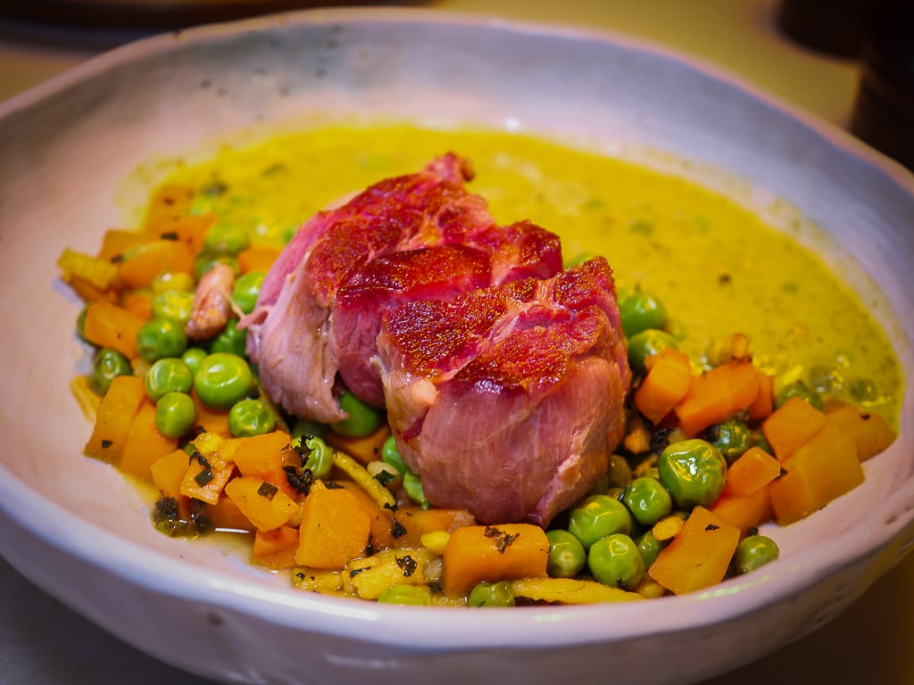 Neck of lamb, with spätzle, carrotsm peas and wild garlic sauce