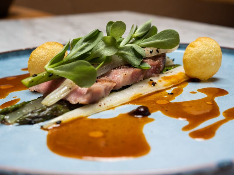 Secreto Iberico pork with pak choi and green asparagus